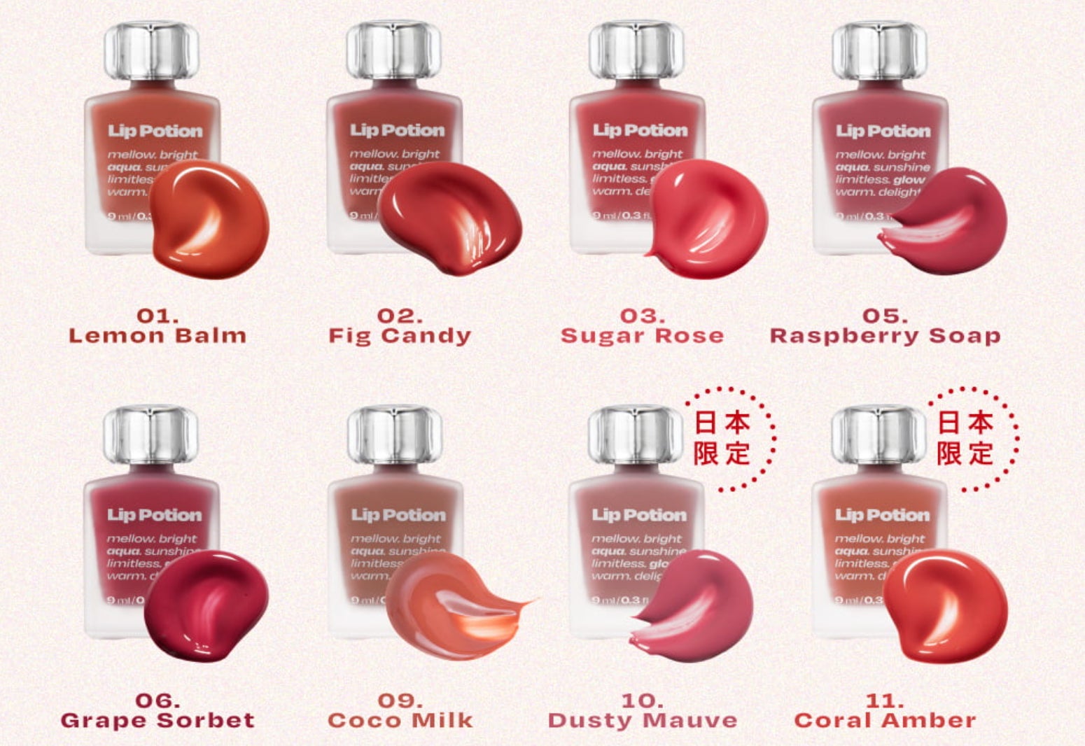 リップポーションアクアグローは、“妙薬瓶”をモチーフにしたパッケージが特徴。リップバームのように保湿しながら、軽いテクスチャーでより使いやすいリキッドを独自に開発。また、バームティント緑茶種子油、ビタミンE、スイセン球根エキスを配合し、唇をやさしくケアします。レモンバーム、フィグキャンディー、シュガーローズ、ラズベリーソープ、グレープシャーベット、ココミルク、ダスティモーヴ(日本限定色)、コーラルアンバー(日本限定色)の8色を日本で展開いたします。