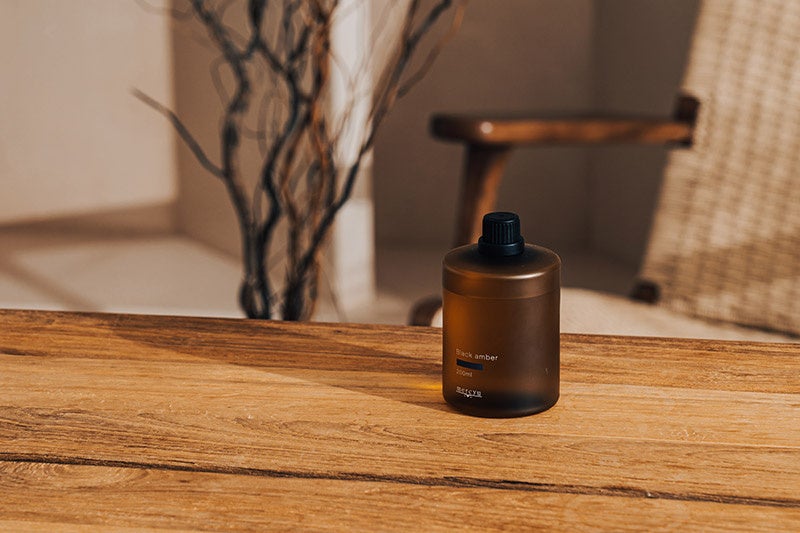 スモーク処理を施した高級感あるボトルで、ネブライザー式ディフューザーに装着しライトをつけると、ボトルを通して柔らかに広がる明かりを楽しめます。