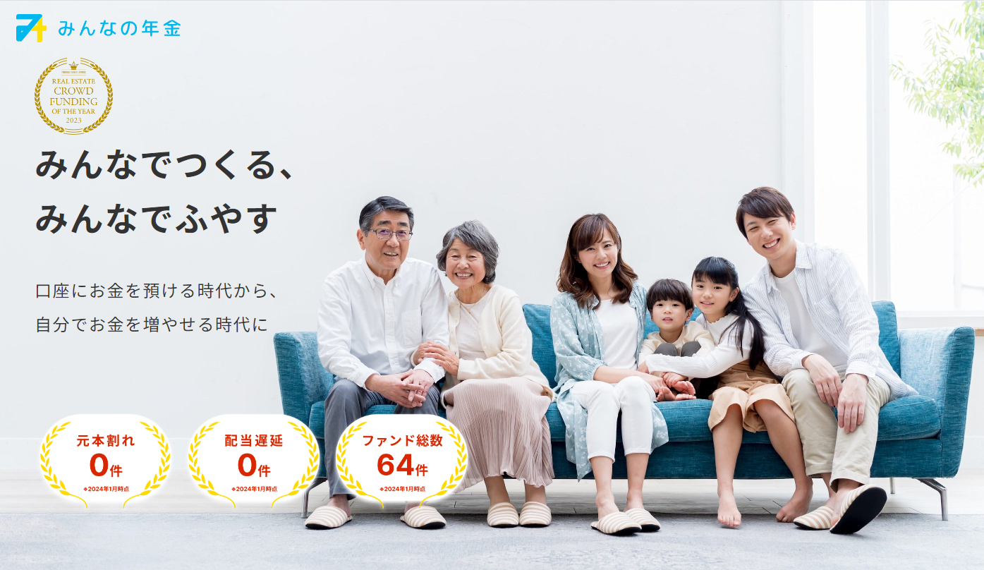 「日本国民の公的年金代わりはここだ!」『みんなの年金』は公的年金とは違った新しい“当たり前”になるプラットフォームを目指して創られた、不動産クラウドファンディングです。日本に今訪れようとしている公的年金問題を解決するために生まれました。低リスク、低コスト、低労力で資産運用を始めることができる画期的なサービスです。