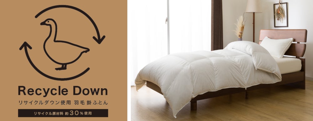 昨年、首都圏15店舗で実施の「羽毛ふとんリサイクルキャンペーン」で回収した羽毛(リサイクル羽毛)を、約30%使用。さらに、側生地にもリサイクル原材料(ポリエステル)を約38%使用しています。