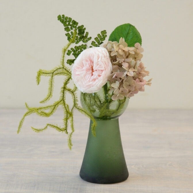 国内の里山資源を活用したプリザーブドフラワーと、再生可能なガラス花器の融合。