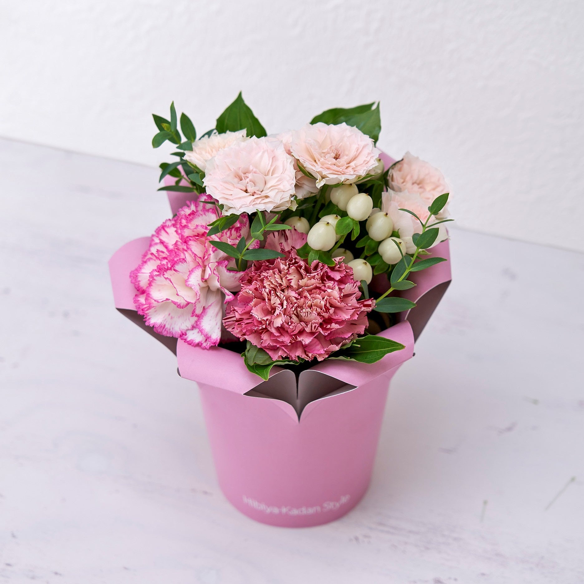 バイオマスプラスチック製花器使用、吸水スポンジ(石油由来のプラスチック)を使わない環境配慮型アレンジメントを提案。