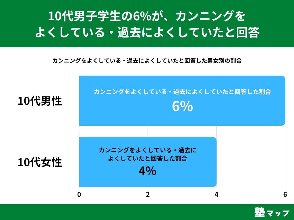 10代男子学生の1割ほどの方が、カンニングを現在もよくしている、もしくは過去によくしていたことが分かりました。