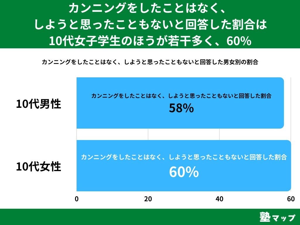 【カンニングをしたことはなく、しようと思ったこともないと回答した割合は10代女子学生のほうが若干多く、60%】