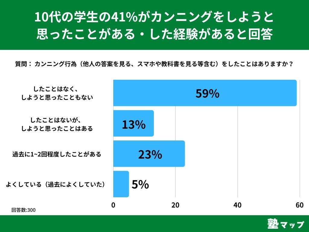 10代の男女を対象とした「カンニング行為(他人の答案を見る、スマホや教科書を見る等含む)をしたことはありますか?」というアンケートで最も多かった回答は「したことはなく、しようと思ったこともない」で59%でした。