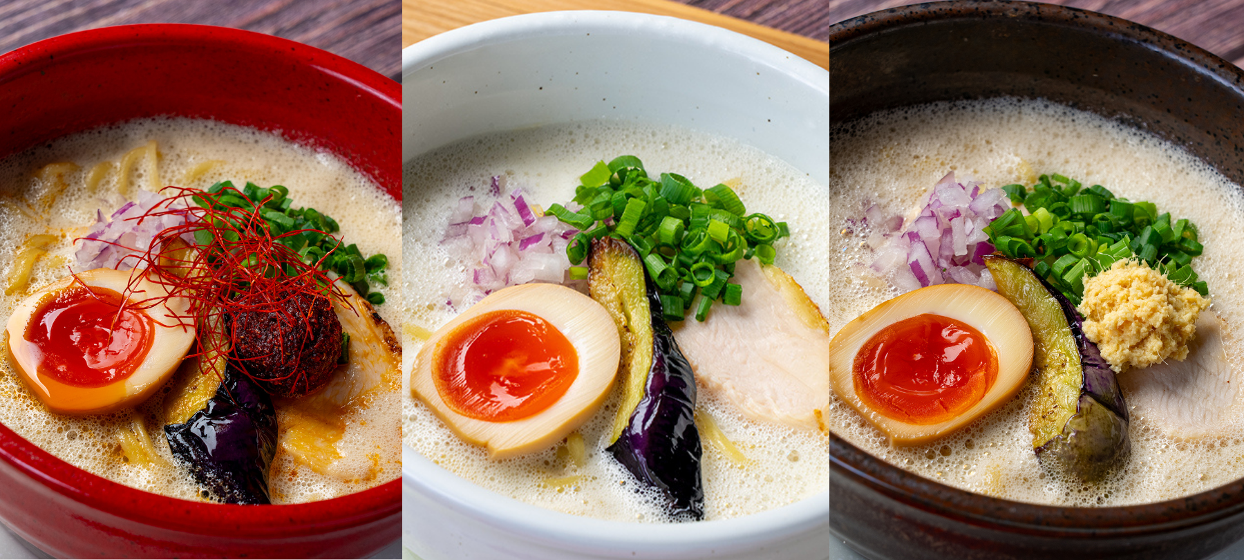 鶏白湯、味噌鶏白湯、辛味噌鶏白湯、のメニューからお選びいただけます。