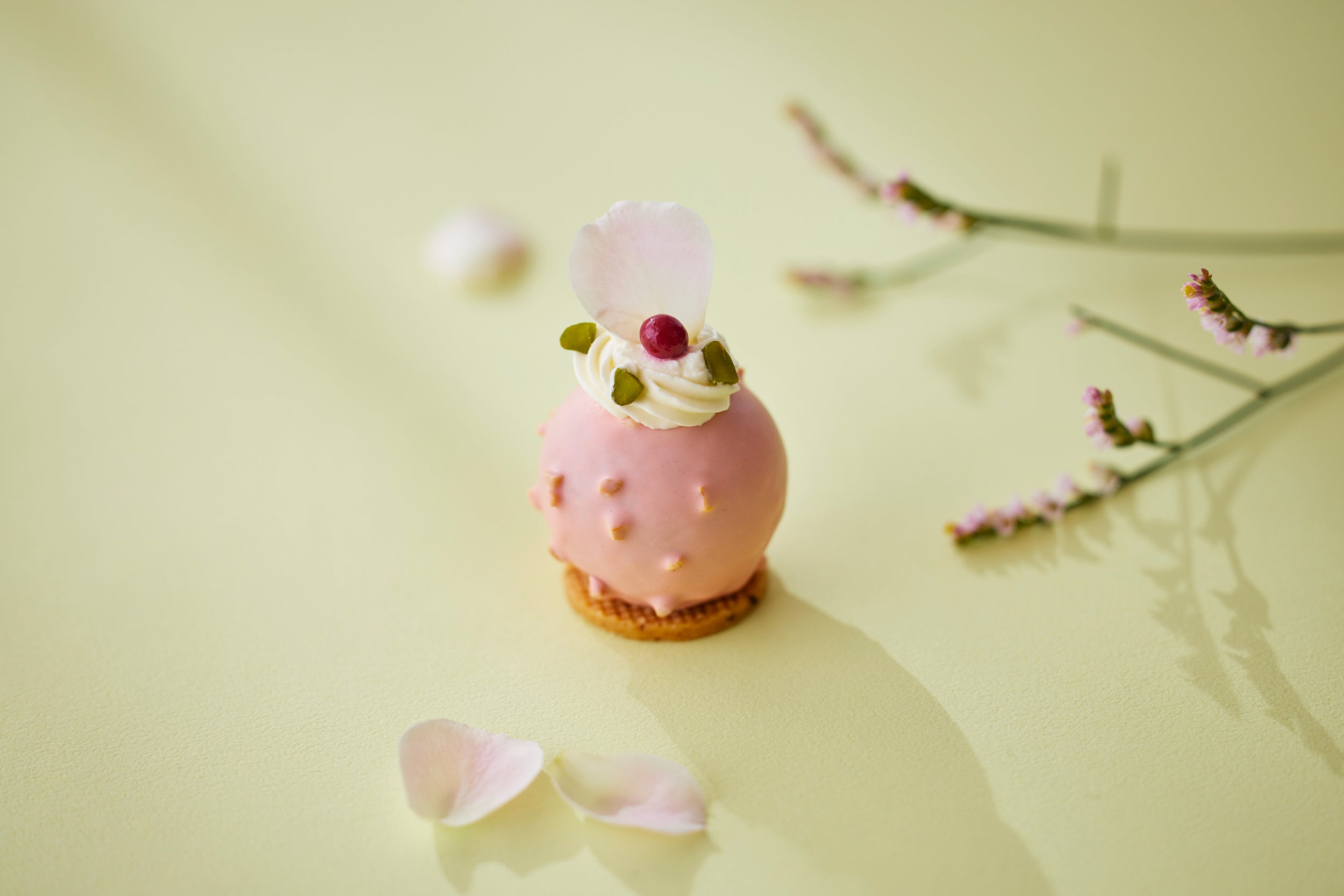 旅の出発は、日本。滑らかな抹茶クリームの上に桜ディプロマットクリームと桜ジェリーが舞い踊るこちらのスイーツは、日本の繊細で美しい春を見事に表現。和 X フレンチのテイストが印象的なこちらのスイーツを是非ご堪能ください。
