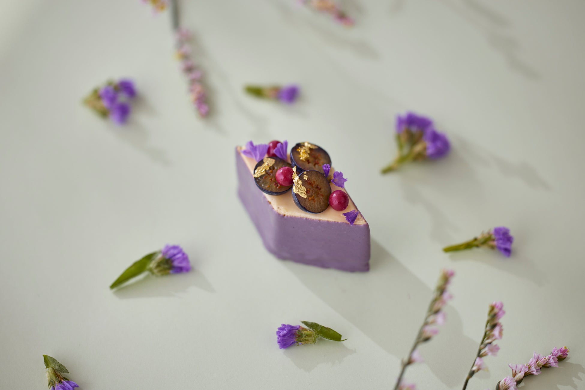 青空の下一面に広がるプロヴァンスのラベンダー畑を美しく表現した「ラベンダーチーズケーキ」。甘酸っぱいブルベリーと優しいラベンダーの香りが一口で味わえる、チーズケーキ好きにはたまらない贅沢な一品です。