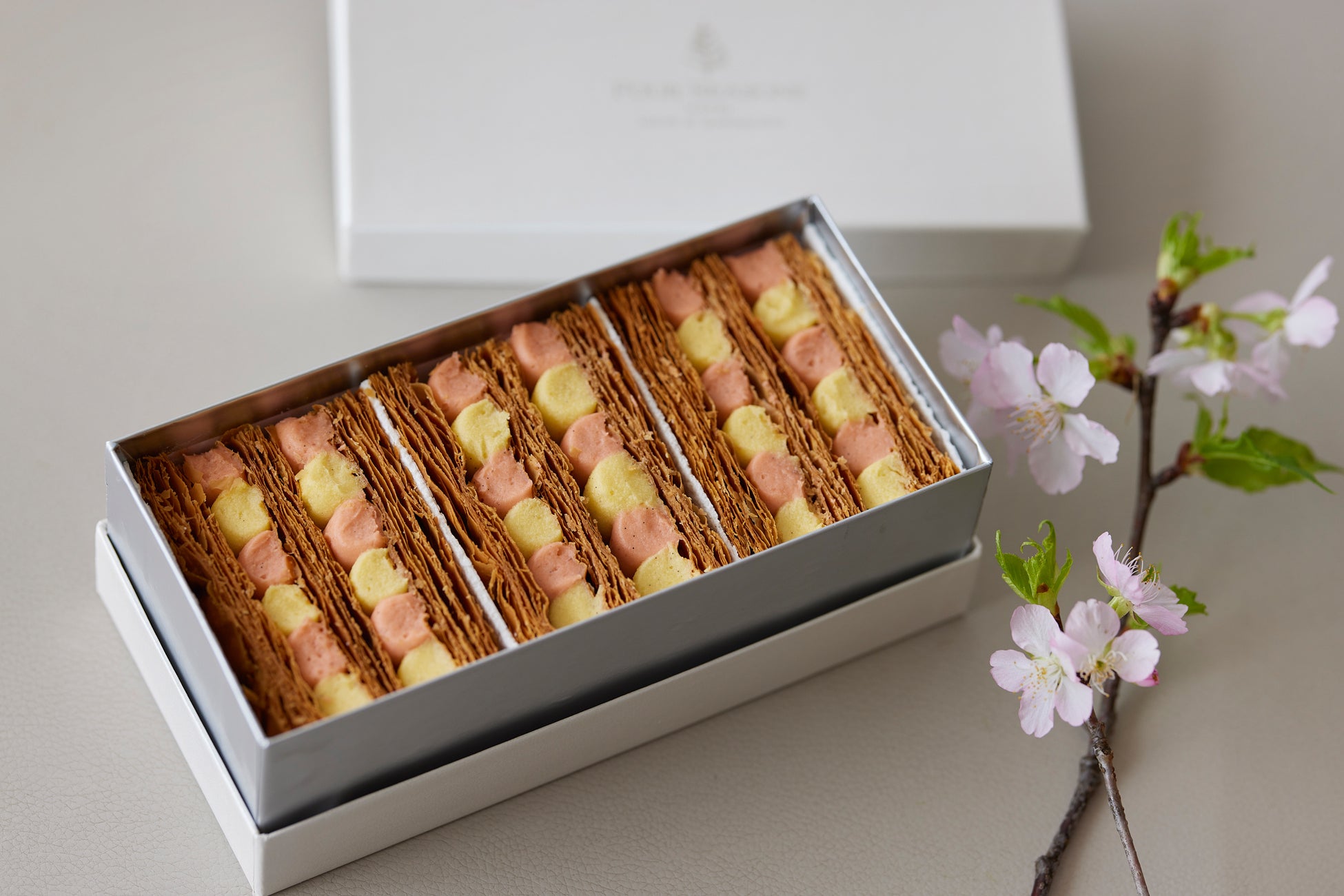 3月18日からの季節のミルフィーユは、桜ミルフィーユ。クリスピーなパイ生地に桜のディプロマットクリーム、そして桜葉とバニラのディプロマットクリームの2種を交互に絞り、メレンゲをのせたクラシックなスタイルに、桜の香りで春を添えました。メレンゲの上に、サクラパウダーのアクセントで仕上げています。