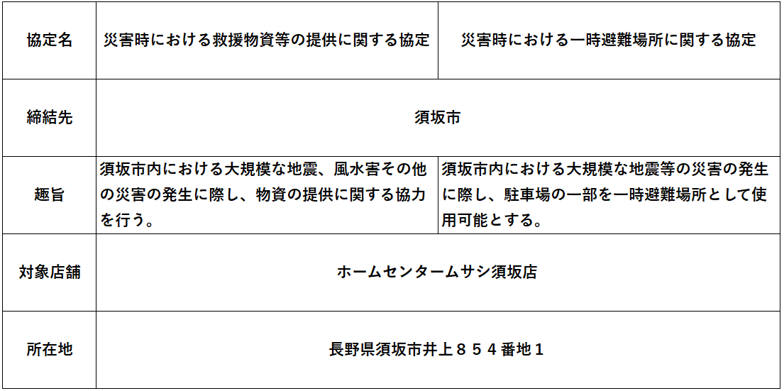 須坂市と「災害時における救援物資等の提供に関する協定」および「災害時における一時避難場所に関する協定」を締結