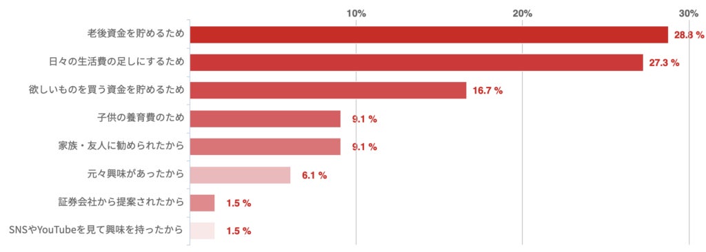 アンケートによれば、回答者が投資を始めたきっかけとしては「老後資金を貯めるため(28.8%)」と「日々の生活費の足しにするため(27.3%)」が多かった。