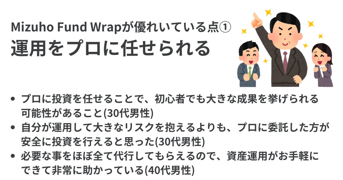 Mizuho Fund Wrapを高く評価する回答者の多くは、その理由に「運用をプロに任せられる」点を挙げていた。