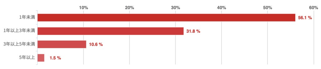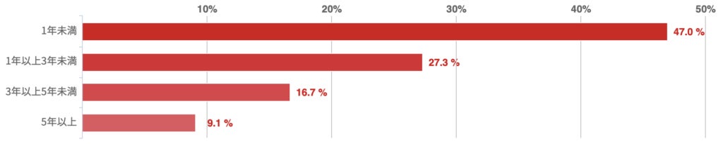 アンケートによれば、「1年未満」または「1年以上3年未満」と答えた回答者が合計で75.3%と大多数を占める結果となった。