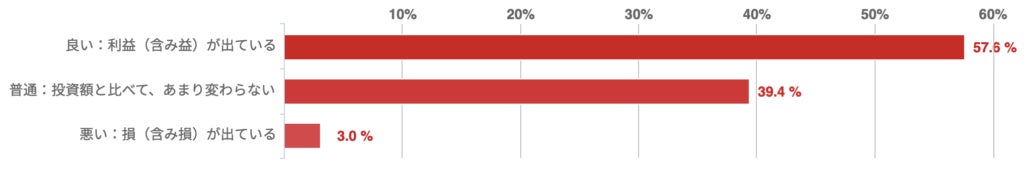 アンケートによれば、57.6%の投資家が「利益(含み益)が出ている」と回答したが、「投資額と比べてあまり変わらない」と答えた投資家も39.4%いた。