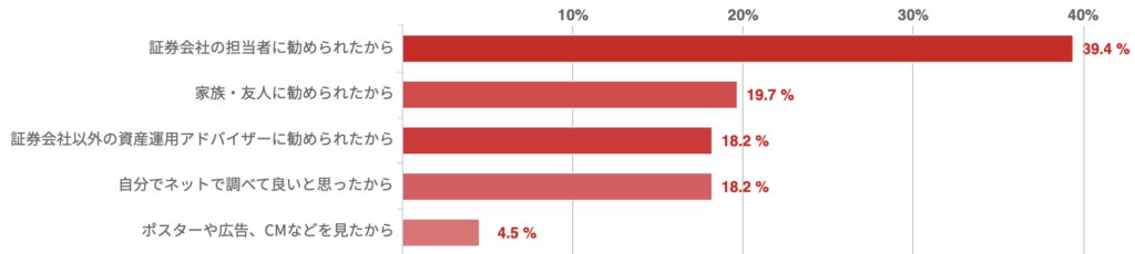 また、その他には「家族・友人に勧められたから(19.7%)」「証券会社以外の資産運用アドバイザーに勧められたから(18.2%)」「自分でネットで調べて良いと思ったから(18.2%)」などの理由が並んだ。