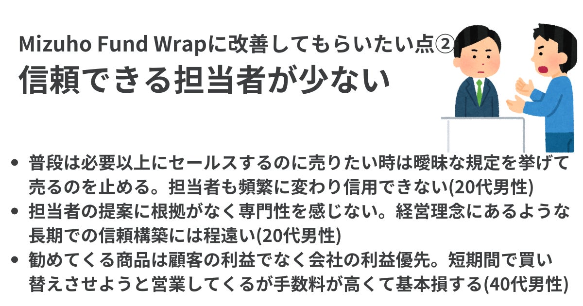 さらに「信頼できる担当者の少なさ」も複数の投資家から指摘されており、「自社の利益しか考えていない提案が目立つ」など、信頼関係が構築できないことに不信感を抱く意見があった。