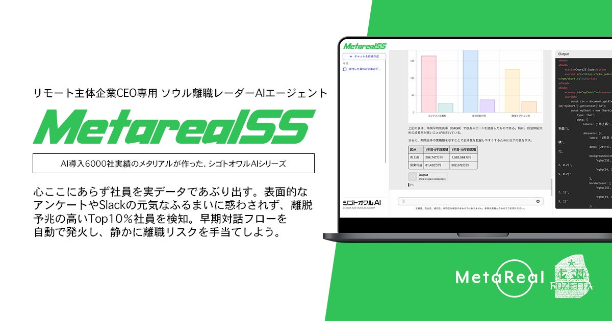 メタリアルグループの株式会社ロゼッタ(代表取締役:五石 順一)は、ソウル離職レーダーAIエージェント「Metareal ソウルステイ」(以下、Metareal SS)を7月10日(木)に新開発・提供開始したことを発表します。