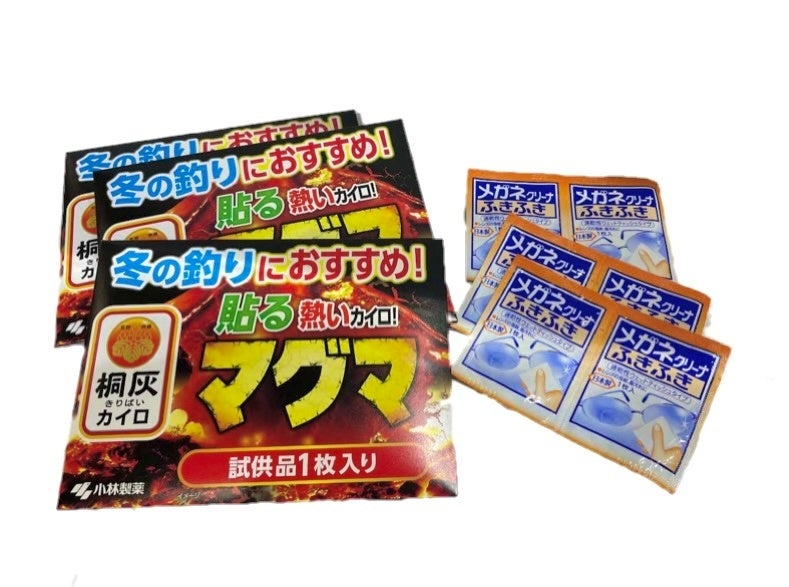 今回配布をしたのは、アウトドアシーンで人気の「桐灰カイロ 貼るマグマ」と「めがねクリーナふきふき」の2製品です。