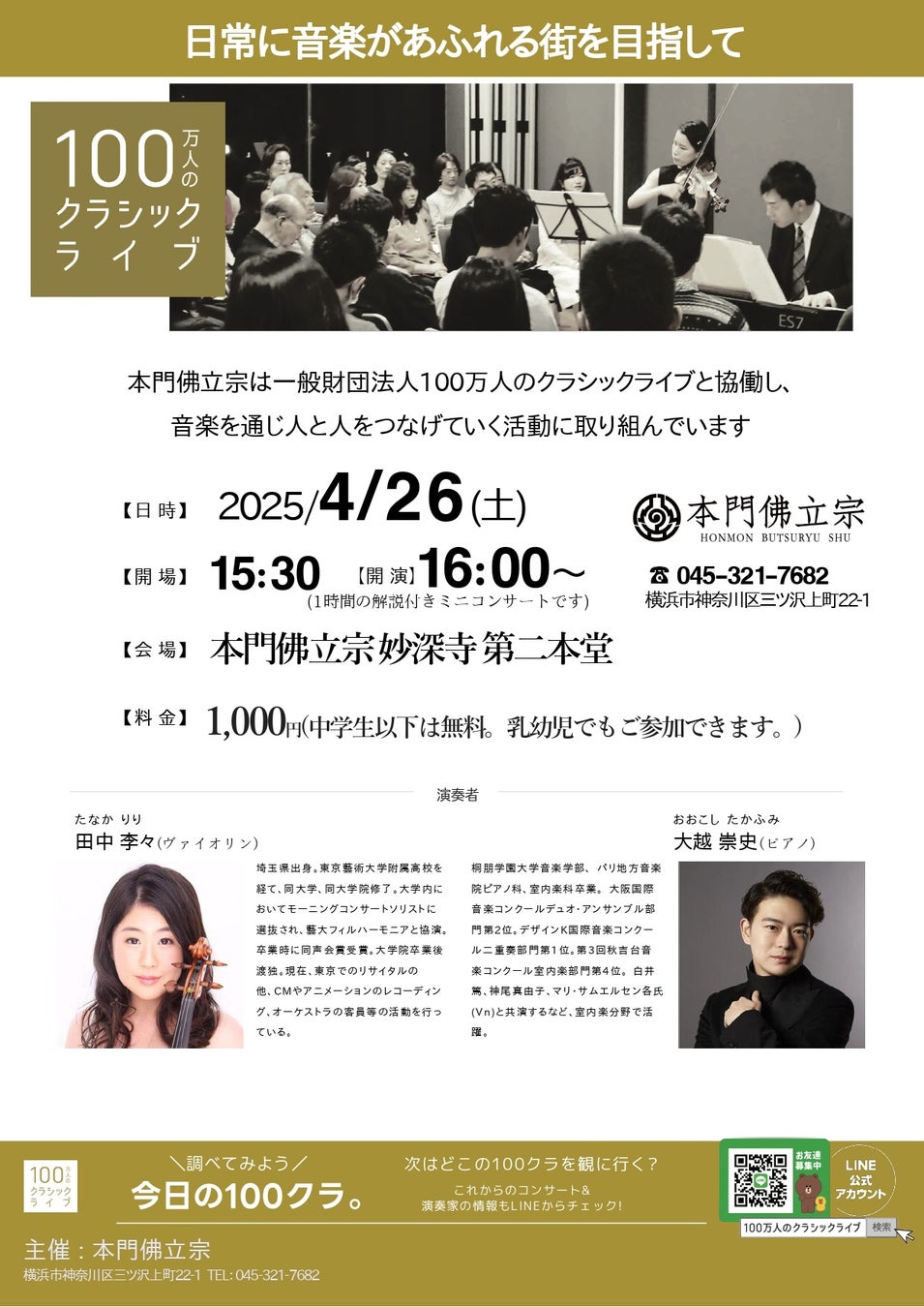 【M&Aベストパートナーズ×100万人のクラシックライブ】4月26日(土)に本門佛立宗 妙深寺にて、クラシックライブを開催!