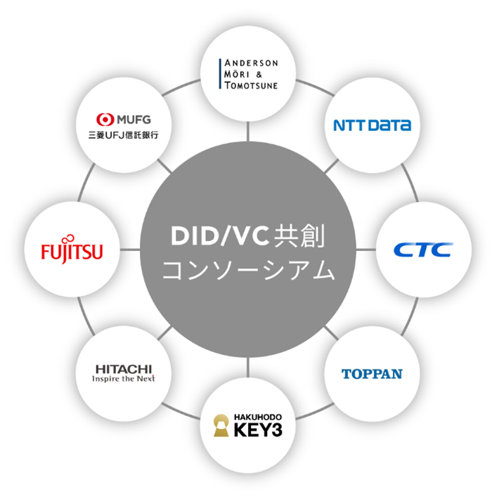 三菱 UFJ 信託銀行株式会社(取締役社長: 長島 巌(ながしま いわお))、株式会社NTTデータ(代表取締役社長:佐々木 裕(ささき ゆたか))、伊藤忠テクノソリューションズ株式会社(代表取締役社長: 柘植 一郎(つげ いちろう))、TOPPANデジタル株式会社(代表取締役社長: 坂井 和則(さかい かずのり))、株式会社博報堂キースリー(代表取締役社長: 重松 俊範(しげまつ としのり))、株式会社日立製作所(執行役社長兼CEO: 小島 啓二(こじま けいじ))、富士通株式会社(代表取締役社長: 時田 隆仁(ときた たかひと))及びアンダーソン・毛利・友常法律事務所外国法共同事業は、分散型ID(Decentralized Identifier、以下 DID(注1))と連携したデジタル証明書(Verifiable Credential、以下 VC(注2))のビジネス共創を目指し、10月10日に「DID/VC共創コンソーシアム」(Decentralized Identifier / Verifiable Credential Co-Creation Consortium、略称 DVCC)を設立しました。