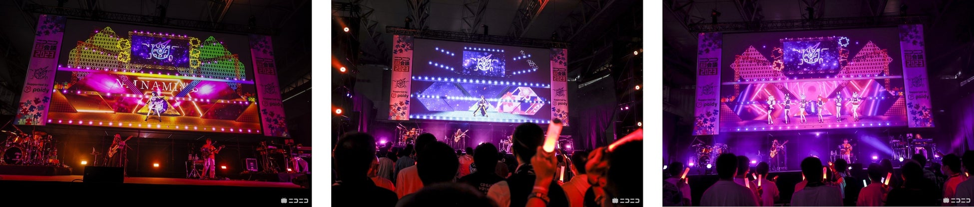 トップバッターを飾ったのは、テレビ朝日発のメタバースアイドル「めたしっぷ」(桜葉ハグ、藤咲まや、黄花はてな、森風るの)、奏みみ、「VALIS」よりNEFFYとRARAの7名。選曲はアップテンポでキャッチーなナンバー『シンデレラ』。バンドセットのゴージャスな演奏をバックに、個性豊かでありながらも親和性の高い歌声とキュートなパフォーマンスでロケットスタートを飾ります。