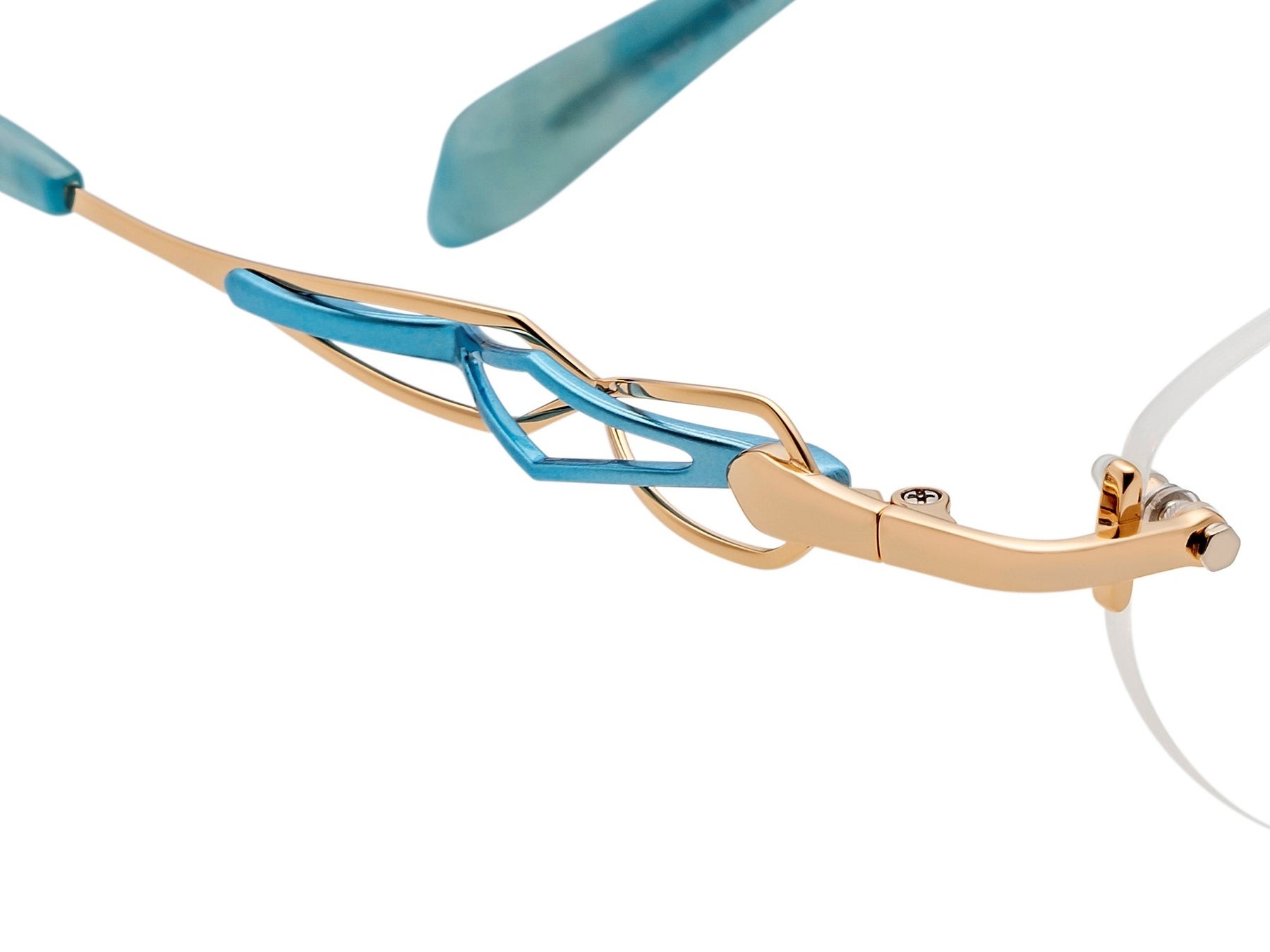 βチタンと樹脂を組み合わせた特徴的なテンプルデザイン。横顔を彩るとともに、バネ性のある素材の特徴を活かし長時間着用しても疲れない掛け心地を実現しています。