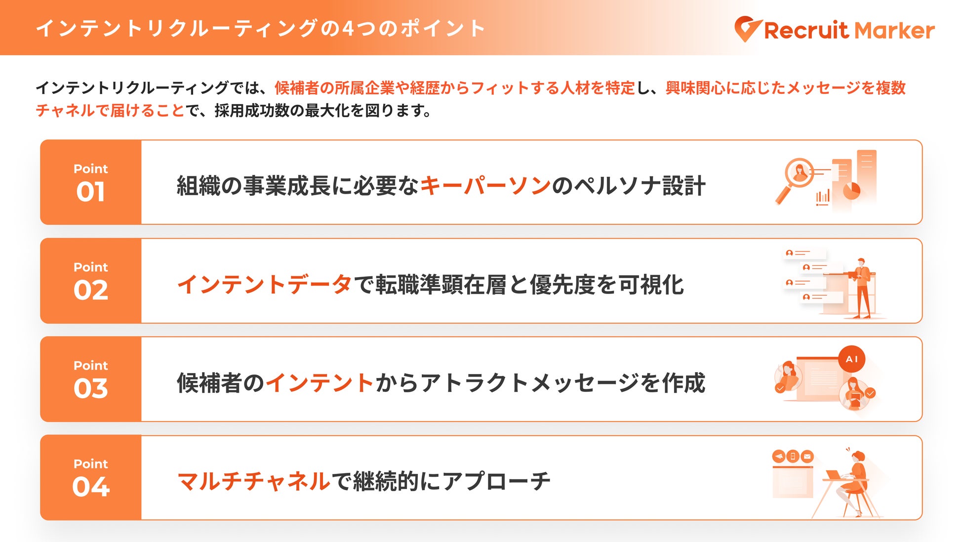 『Recruit Marker』は、「インテントリクルーティング4つのポイント」を通じて、誰よりも早く“隠れた優秀層”を見極め、最適なアプローチで出会いにつなげることを支援します。