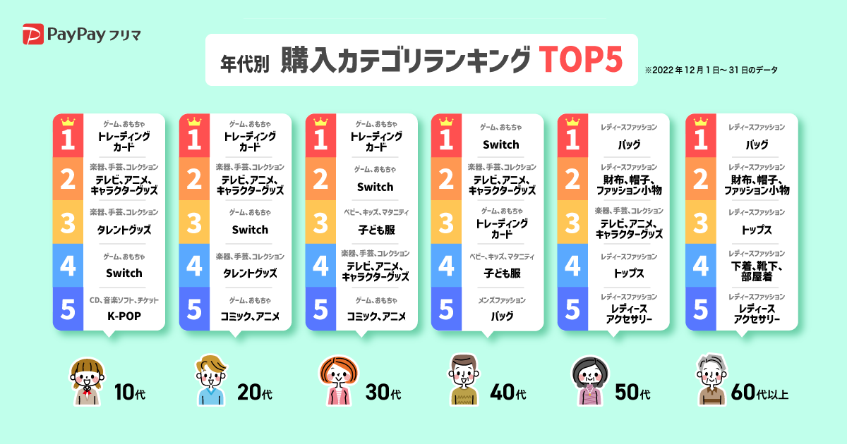 ヤフー株式会社が提供するフリマアプリ「PayPayフリマ」は、10代から60代以上の年代別購入カテゴリランキングを発表しました。(集計期間:2022年12月1日~12月31日)