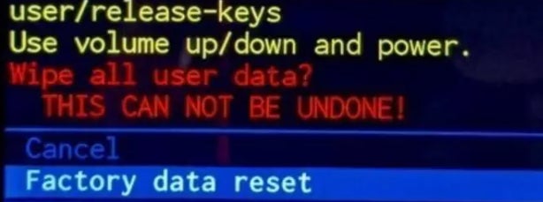 Step3:音量ボタンを操作して「Factory data reset」を選び、電源ボタンを押します。