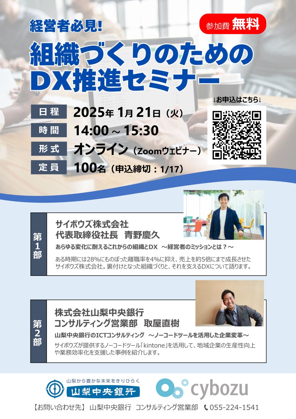 【第1部】 あらゆる変化に耐えるこれからの組織とDX~経営者のミッションとは?~ 講師:サイボウズ株式会社 代表取締役社長 青野 慶久 氏 【第2部】 山梨中央銀行のICTコンサルティング~ノーコードツールを活用した企業変革~ 講師:山梨中央銀行 コンサルティング営業部 取屋 直樹 |
