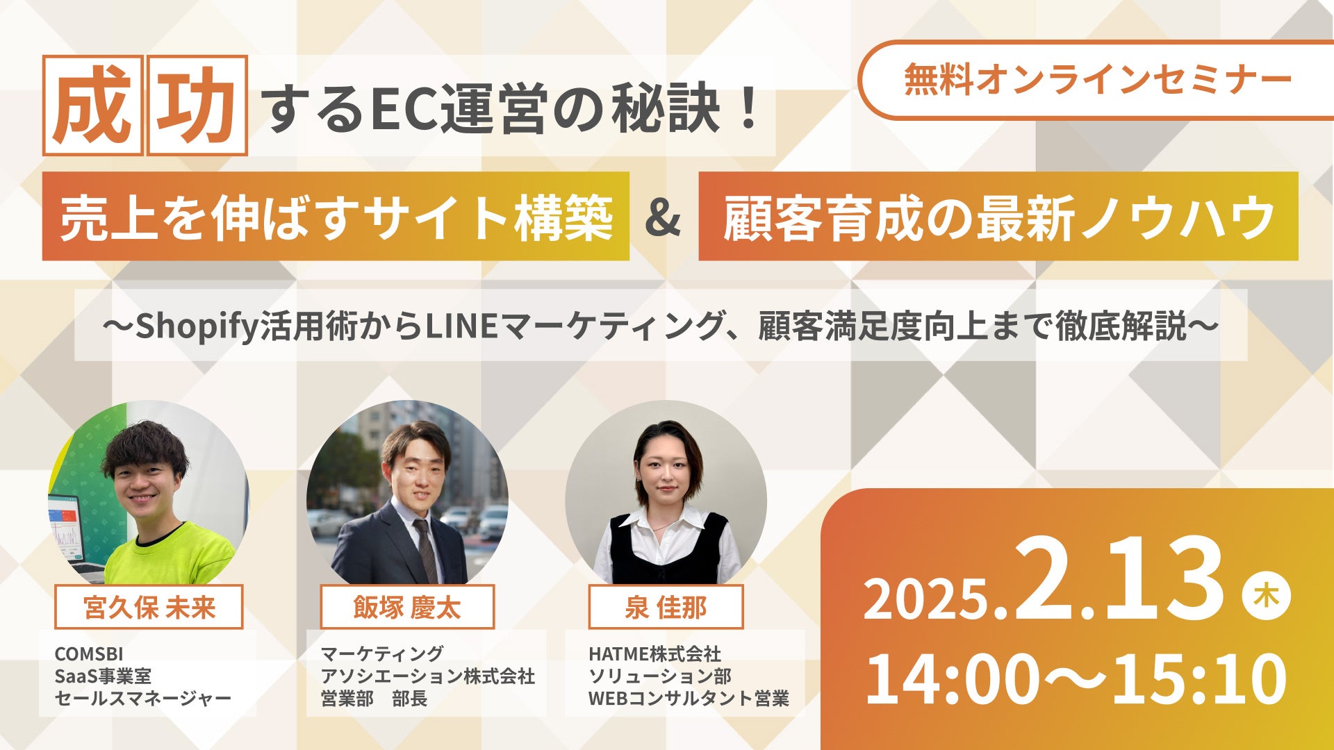 マーケティングアソシエーション株式会社の子会社であるHATME株式会社(本社:東京都台東区 代表取締役:中園広和、以下当社)は2025年2月13日(木)に、株式会社ソニックムーブとマーケティングアソシエーション株式会社と3社共催ウェブセミナー「成功するEC運営の秘訣!売上を伸ばすサイト構築&顧客育成の最新ノウハウ~Shopify活用術からLINEマーケティング、顧客満足度向上まで徹底解説~」を、開催いたします。
