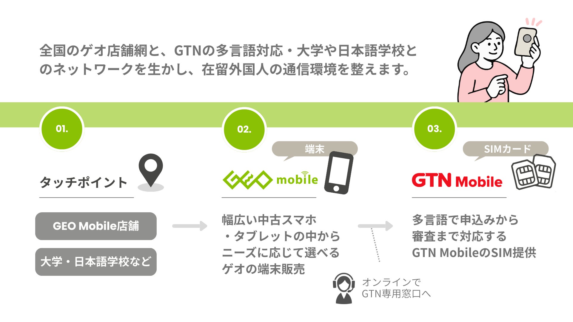 全国のGEO mobile(ゲオ)の店舗網を端末提供の接点(タッチポイント)とし、在留外国人が通信サービスを利用し始めるまでのプロセスを一体的に支援します。具体的には、店頭での端末購入後、オンラインでGTN Mobile(GTN)の多言語対応専用窓口に接続し、SIMの申し込みや審査をシームレスに行う体制の整備に取り組みます。両社のリソースを掛け合わせることで、来日直後や地方在住の方でも安心して通信サービスを構築できるサポート体制の確立を目指します。