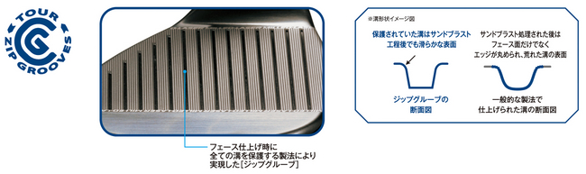 独自の塗膜によるすべての溝を保護する製法により、グルーブ(溝)容積を大幅にアップさせたツアージップグルーブテクノロジーを採用。インパクト時のフェースとボールとの間の異物(芝や砂、水分など)の影響をできる限り抑えることで、どんなライからでも安定したスピン性能を実現します。