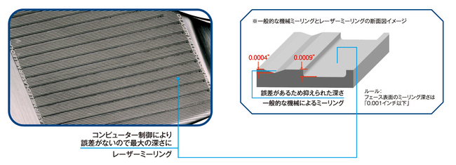 サンドブラストや機械を使用したフェースのミーリング、研磨など従来の製法では実現できなかった、精密で正確なフェース仕上げを実現するため、レーザー照射によるミーリング加工を採用しました。これによりフェースの平面精度を極限まで高め、安定したスピンが得られるようになりました。