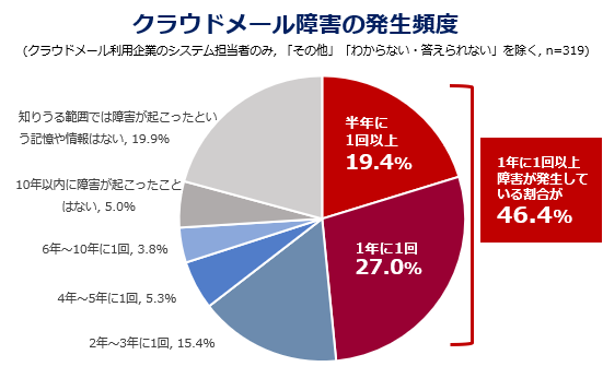 クラウドメールの障害が1年に1回以上発生している割合は46.4%と半数弱です。