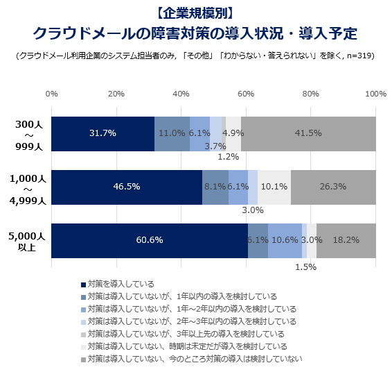 企業規模が大きいほどクラウドメールの障害対策の導入率は高いが、5,000人以上の大規模企業でも2割弱が対策の導入も検討もしていない