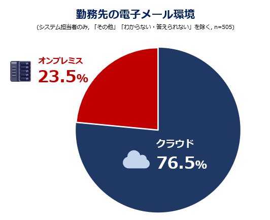 勤務先の電子メール環境は、クラウドが76.5%、オンプレミスが23.5%です。約3/4の企業がクラウドを利用していることがが分かりました。