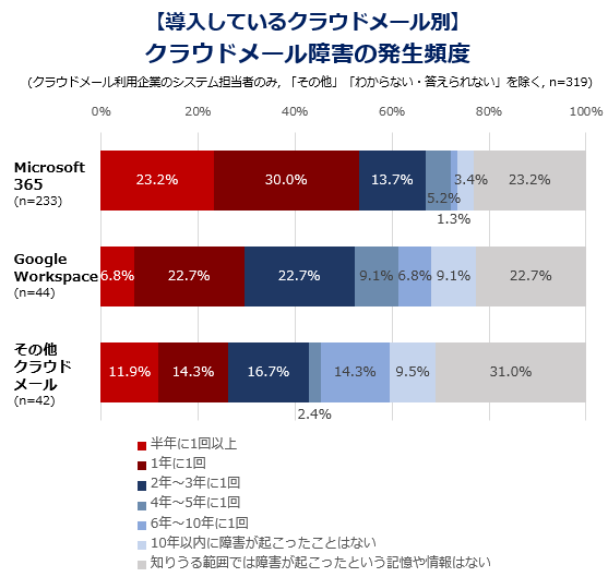 Topic1から、導入しているクラウドメールは「Microsoft 365」が過数ですが、Microsoft 365で「1年に1回以上」の障害が発生している割合は53.2%です。その割合は「Google Workspace」(29.5%)や「その他のクラウドメール」(26.2%)より多く、これが全体の傾向に大きく影響を与えています。
