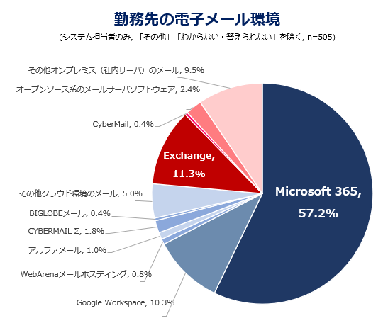 導入している製品は、Microsoft 365が57.2%と過半数を占め、次いでExchange 11.3%、Google Workspace 10.3%でした。