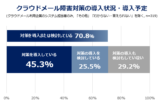 「対策を導入している」は45.3%、「対策は導入していないが導入を検討している」は25.5%で、合せて70.8%がクラウドメールの障害対策を導入または検討しています。一方、「対策の導入も検討もしていない」は29.2%です。