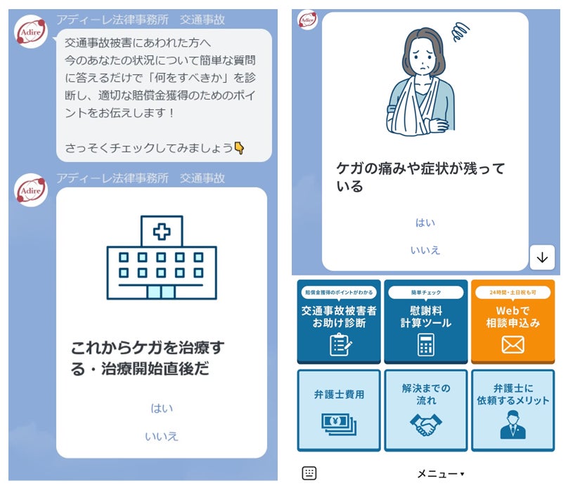 アディーレ法律事務所(東京都豊島区、代表弁護士・鈴木淳巳、以下「アディーレ」*)は、交通事故にあわれた方へ、状況別に適切な賠償金獲得のためのポイントをお伝えするLINE診断サービス「交通事故被害者お助け診断」を開始しました。