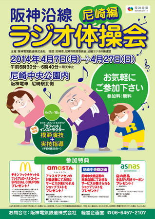 阪神電気鉄道株式会社(本社:大阪市福島区、社長:藤原崇起)では、4月7日(月)から4月27日(日)までの間、阪神尼崎駅前の尼崎中央公園において、ラジオ体操イベント「阪神沿線ラジオ体操会~尼崎編~」を開催します。