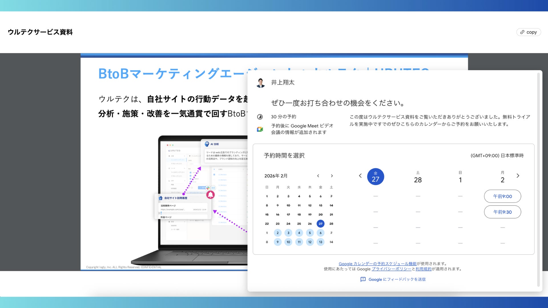資料を「一部公開」して関心を惹きつけ、読者の関心が最も高まった箇所に任意のスライドでポップアップを表示します。ここにGoogleカレンダー等の商談予約フォームを直接埋め込むことで、ページ遷移による離脱を防ぎ、関心が高まった状態のまま「その場での商談化」を実現します。