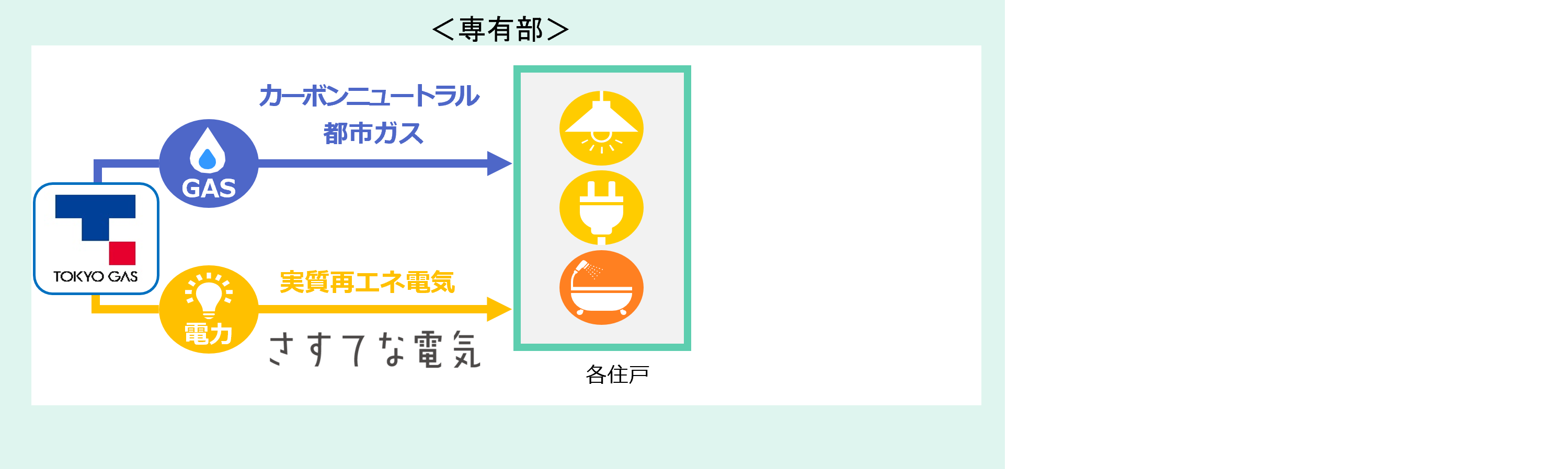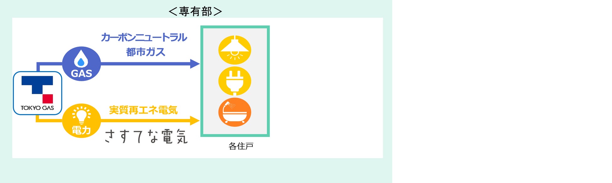 本物件は、エネルギー利用におけるCO2排出量実質ゼロの新築分譲マンションとなっております。CO2排出量実質ゼロを実現するために共用部で使用する電気は、本建物の屋上に設置予定の太陽光パネルからの発電と東京電力「グリーンベーシックプラン」、専有部で使用する電気・ガスについては、それぞれ東京ガスの「さすてな電気」と「カーボンニュートラル都市ガス」を採用すること により、家庭でのCO2排出削減に貢献しております。なお、本物件は東京ガスが新築分譲マンションの専有部向けに「カーボンニュートラル都市ガス」の実供給を行なう最初の物件となります。また、東京ガスが新築分譲マンションの専有部向けに「カーボンニュートラル都市ガス」および「さすてな電気」の両方を実供給するのは東京都初の取り組みとなります。