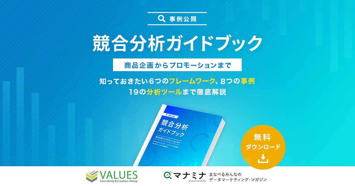 インターネット行動ログ分析によるマーケティング調査・コンサルティングサービスを提供する株式会社ヴァリューズ(本社:東京都港区、代表取締役社長:辻本 秀幸、以下「ヴァリューズ」)は、運営するデータマーケティング・メディア「マナミナ」にて公開した記事から厳選し、知っておきたい6つのマーケティング・フレームワーク、8つの事例、19の分析ツールを収録した「競合分析ガイドブック」を公開しました。