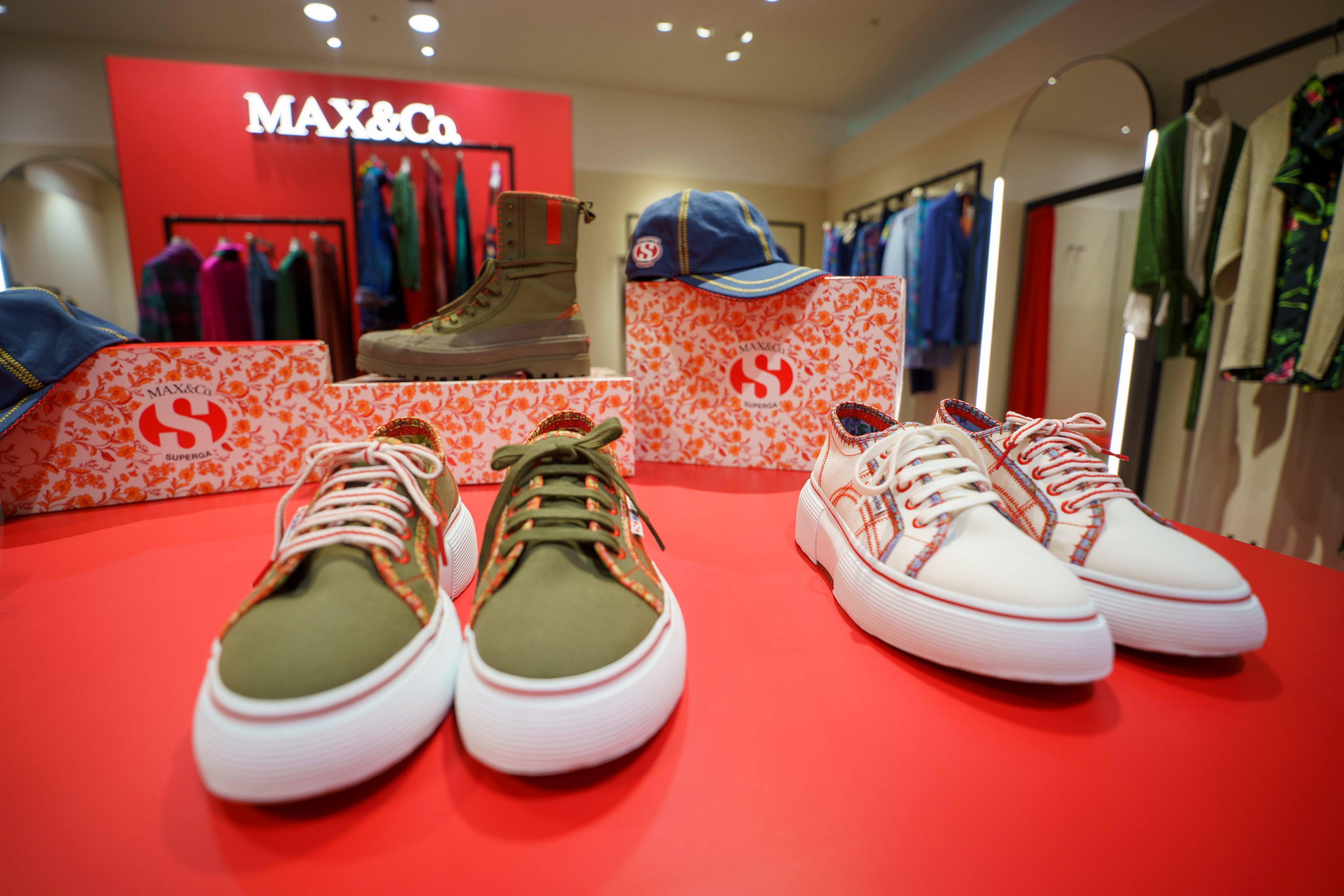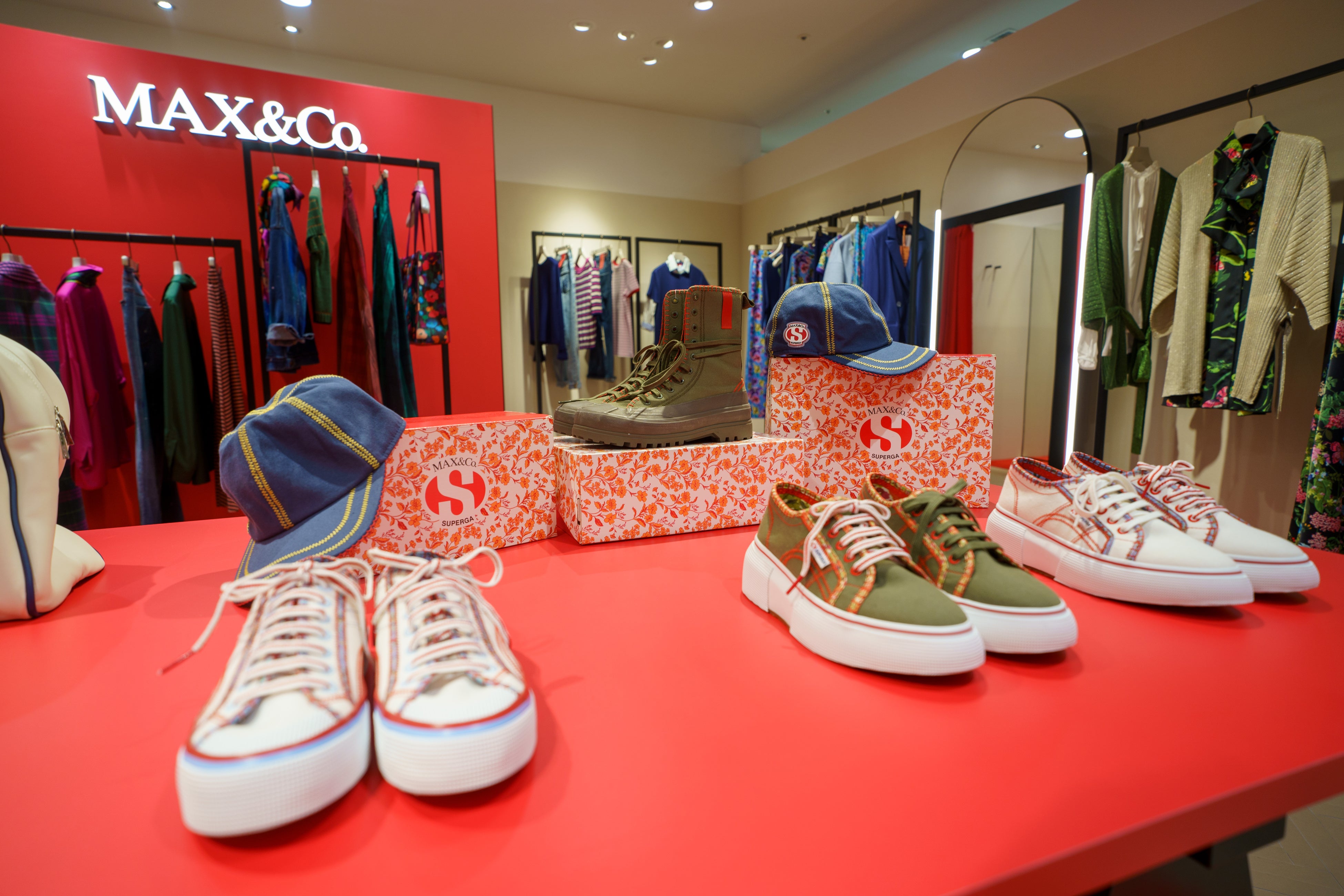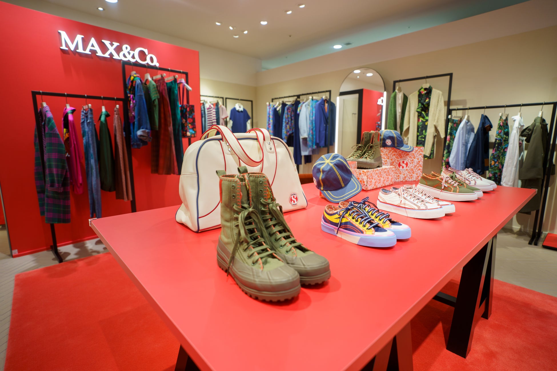 同店では、マックス アンド コーを代表するアイコニックなラナウェイコートや、2023秋冬コレクションにおけるイタリアのフットウェアブランド「Superga」とのコラボレーションカプセルコレクションアイテムなどを取り揃えています。