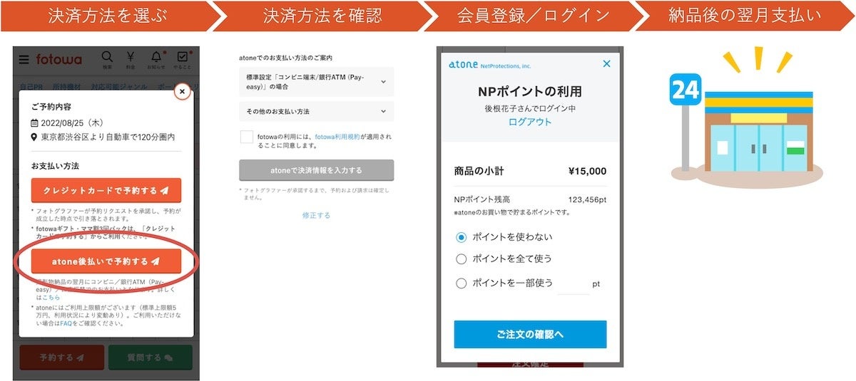 atoneを導入することにより、fotowaのご利用料金を、撮影データ納品の翌月にコンビニ払い/銀行ATM(Pay-easy)/口座振替のいずれかでもお支払いいただけるようになります。そのため、クレジットカードをお持ちでない方や、納品後のお支払いを希望される方の利便性向上だけでなく、初めてご利用する際に感じやすい「納品前に支払って大丈夫?」といった不安も解消することができます。