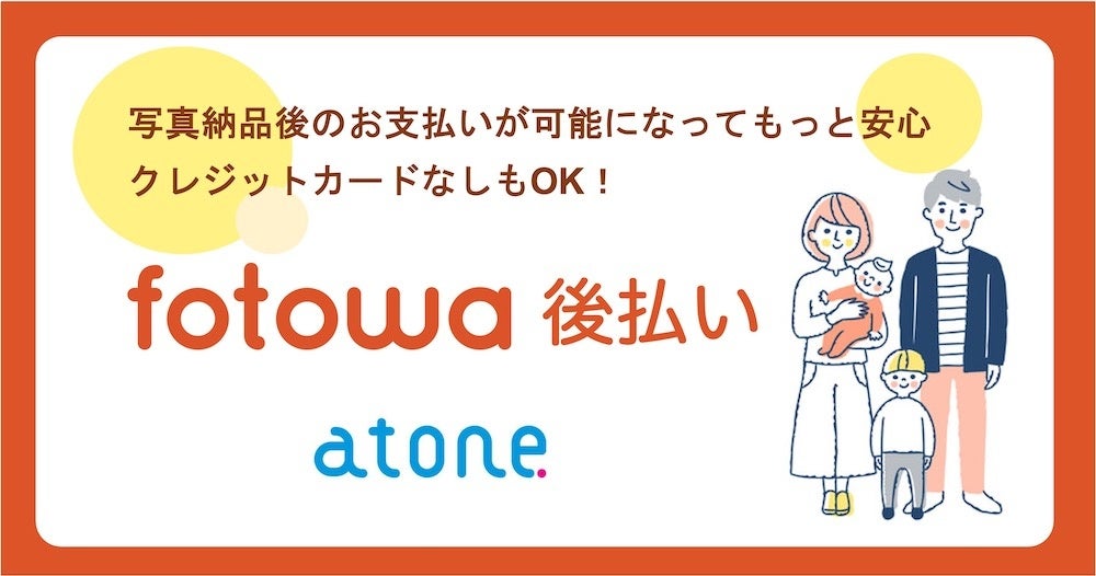 ピクスタ株式会社(東京都渋谷区 代表取締役社長:古俣大介、東証グロース:3416、以下「ピクスタ」)が運営する、家族・子ども向け出張撮影プラットフォーム「fotowa(フォトワ)」(https://fotowa.com/)は、株式会社ネットプロテクションズ(東京都千代田区 代表取締役社長:柴田 紳)が提供するBtoC向け会員制決済サービス「atone (アトネ)」(https://atone.be/)を使用した「後払い決済」を導入いたしました。