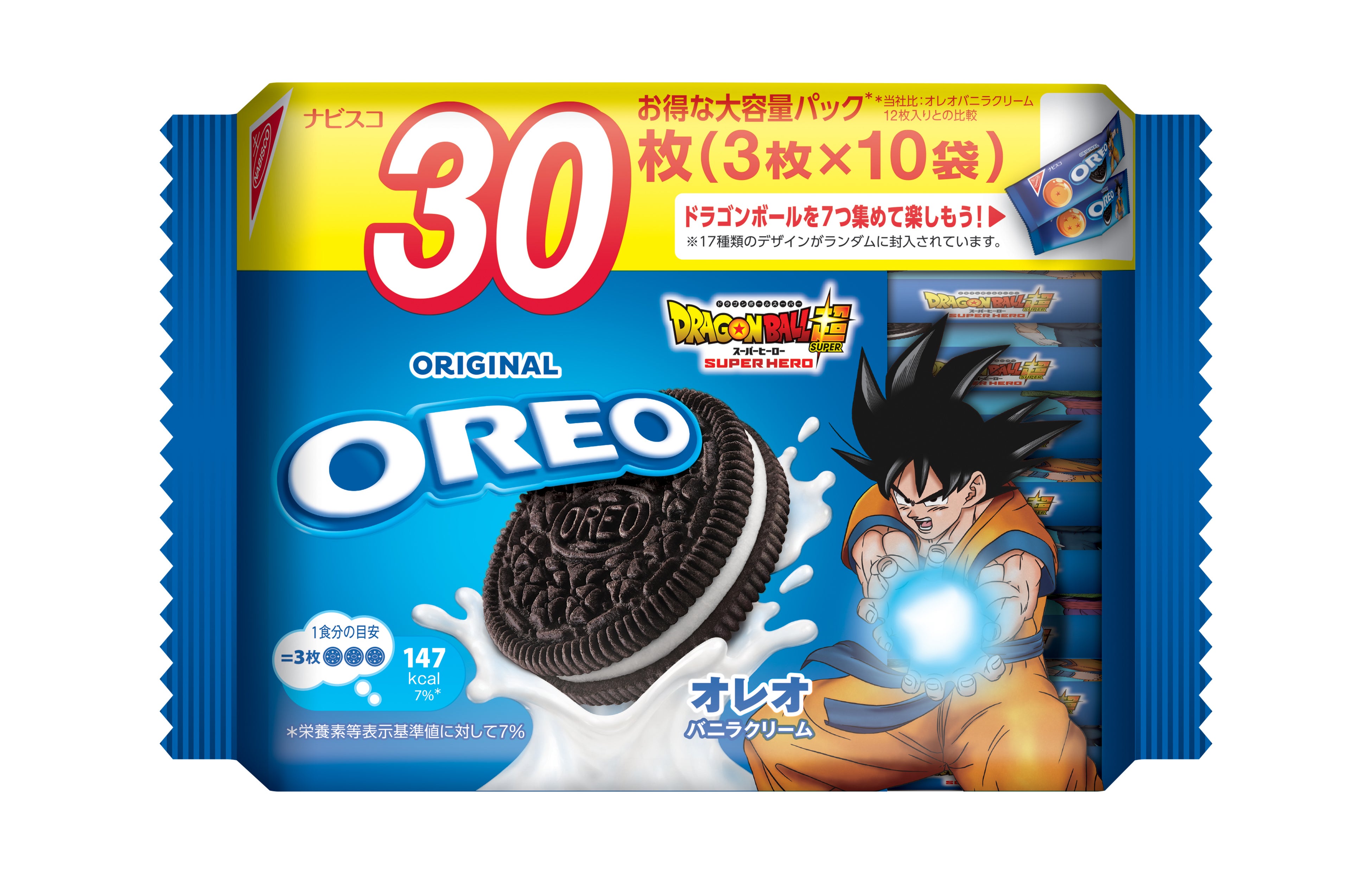 モンデリーズ・ジャパン株式会社(本社:東京都品川区/代表取締役社長:福本千秋)は、ビスケットブランド「オレオ」から、国民的人気アニメ「ドラゴンボール」の劇場版最新作、映画「ドラゴンボール超 スーパーヒーロー」とコラボレーションした「オレオ ドラゴンボールパック バニラクリーム 30枚」を4月18日(月)より全国のスーパーマーケット、コンビニエンスストア、ドラッグストアなどで期間限定販売します。