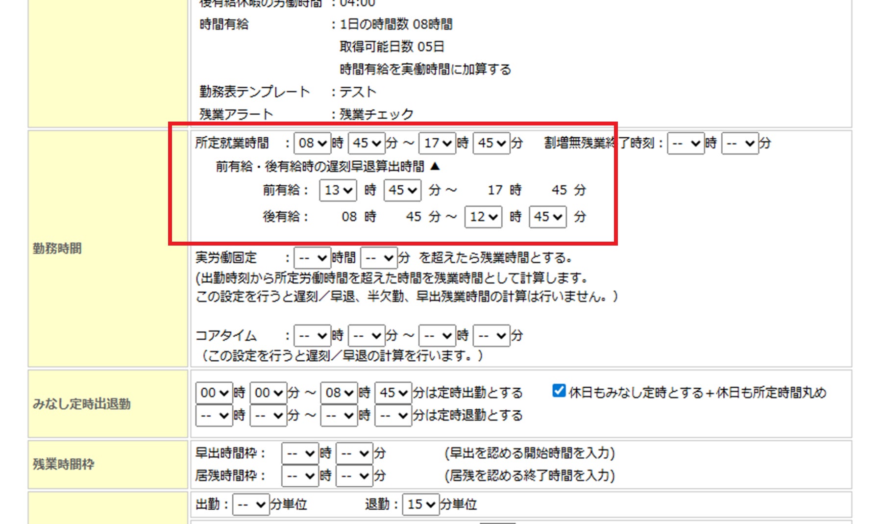 午前休、午後休取得時の出退勤時間に応じて、遅刻・早退時間を自動判定
